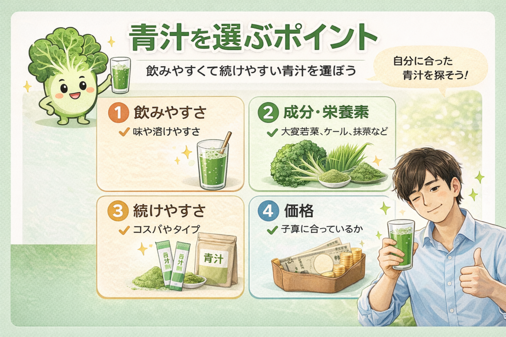 青汁を選ぶ際には、次のポイントをチェックしましょう。
